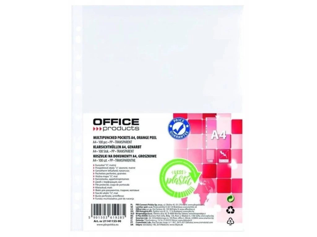Priehľadné euroobaly OFFICE PRODUCTS vo formáte A4 s matným povrchom a hrúbkou 35 µm. Vhodné na ochranu a archiváciu dokumentov v zakladačoch s eurodierovaním. Balenie obsahuje 100 kusov.