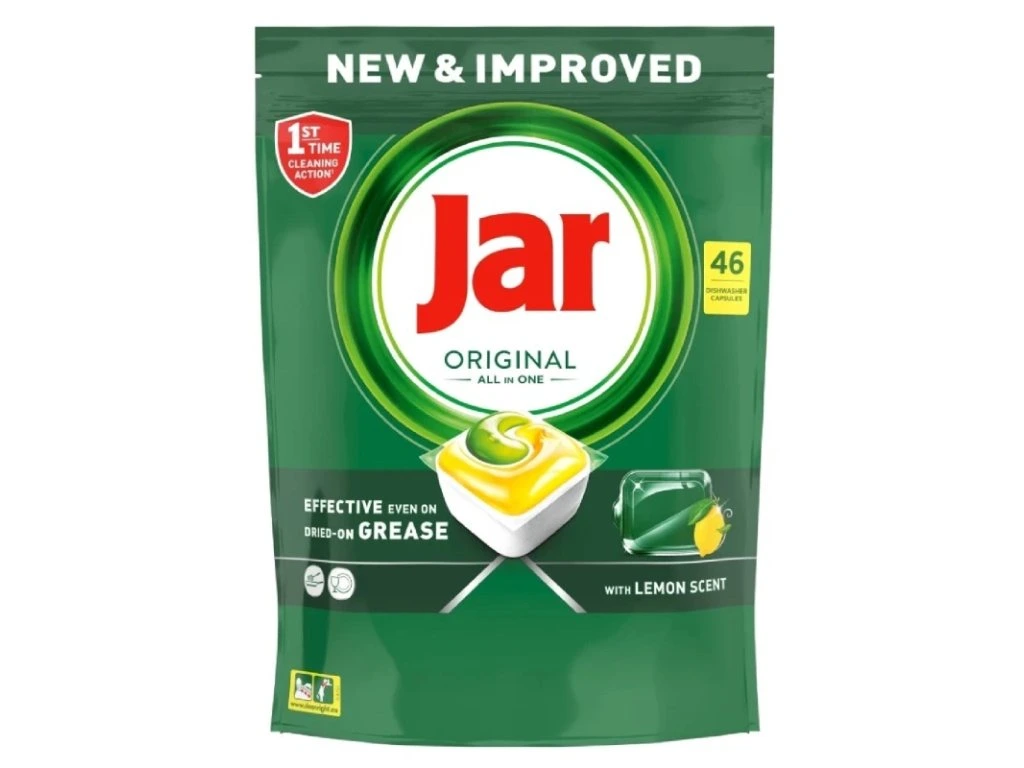Tablety do umývačky Jar Original All-in-One účinne odstraňujú aj odolné nečistoty už pri prvom umývaní. Praktické kapsule obsahujú čistiaci prostriedok, soľ aj oplachovací prostriedok. Balenie obsahuje 46 kapsúl.