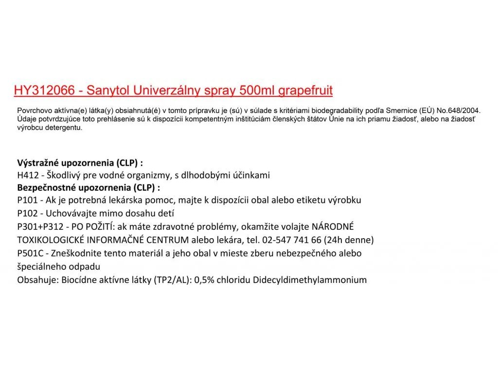 Sanytol dezinfekčný sprej 500 ml – Grapefruit účinne ničí baktérie, vírusy a plesne na povrchoch a zanecháva príjemnú sviežu vôňu grapefruitu. Ideálny pre domácnosti aj profesionálne prostredie.