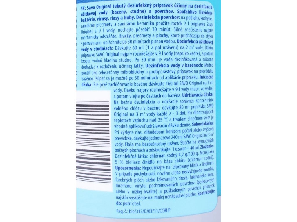 Tekutý dezinfekčný prípravok na dezinfekciu vody a povrchov. Spoľahlivo likviduje baktérie, vírusy, riasy a huby. SAVO Original likviduje choroboplodné zárodky, baktérie a vírusy (vrátane HIV a HBV), riasy a nižšie huby, odstraňuje pachy. Vyniká mimoriadne vysokou čistotou, dlhou záručou lehotou a unikátnou ekologickou hodnotou, pre ktorú je schválený aj pre dezinfekciu vody v bazénoch a ako jediný aj pre pitnú vodu v studniach. Dezinfekcia povrchov:na podlahy, kuchyne, sanitárne predmety a sanitárnu keramiku použite roztok 2 l prípravku Savo original a 9 l vody, nechajte pôsobiť 30 minút. Silné znečistenie najprv mechanicky odstráňte. Hračky, predmety a plochy, ktoré prichádzajú do styku s potravinami, opláchnite po 30 minútach pitnou vodou.