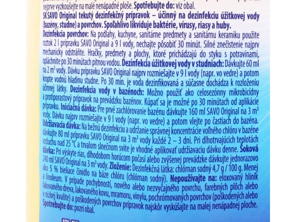 SAVO Original spoľahlivo likviduje choroboplodné zárodky, baktérie a vírusy (vrátane HIV a HBV), riasy a nižšie huby, odstraňuje pachy. Vyniká dlhou záručnou lehotou a unikátnou ekologickou hodnotou, pre ktorú je schválený i pre dezinfekciu vody v bazénoch a ako jediný i pre pitnú vodu v studniach. Slúži k čisteniu a dezinfekciu podláh, nábytku, kuchynského a hygienického náčinia. Objem 4 kg.